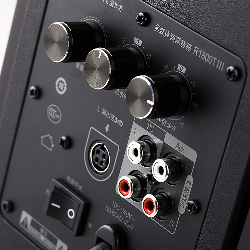 漫步者R1800TIII采用了后调节设计,不仅充分利用了后面板空间,同时也保持了音箱整体视觉的统一、优雅。主音量电位器更是采用无极调节设计,不仅寿命长久,旋钮操控质感也一扫同档音箱的迟滞体验,力度适当,体验不凡。独立的高低音调节设计,也方便用户随意“烹饪”个人专属音乐口味。调节旋钮的下方布局紧凑、整齐,PC、AUX双路立体声音频输入,方便接换不同音源设备。线路输入端口下方的“100V-240V”数字标示,即全球宽幅电压技术。应用了这项技术的R1800TIII工作稳定性大大提高,完美解决了电压不稳定地区用户的后顾之忧。