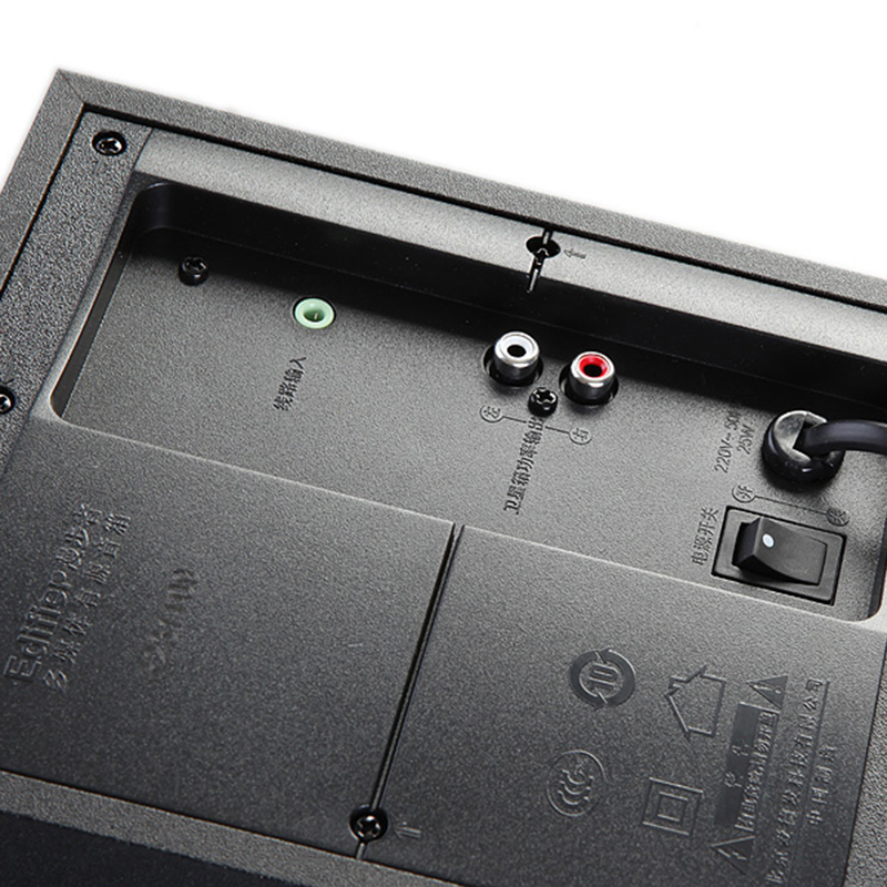 低音箱背部接线简洁明了,电源、信号输入和两组卫星箱输出接口依次排列,让音箱的连线更加容易,走线也更加清晰,加上音箱本身的小巧体积,非常适合放在空间较小的电脑桌上。